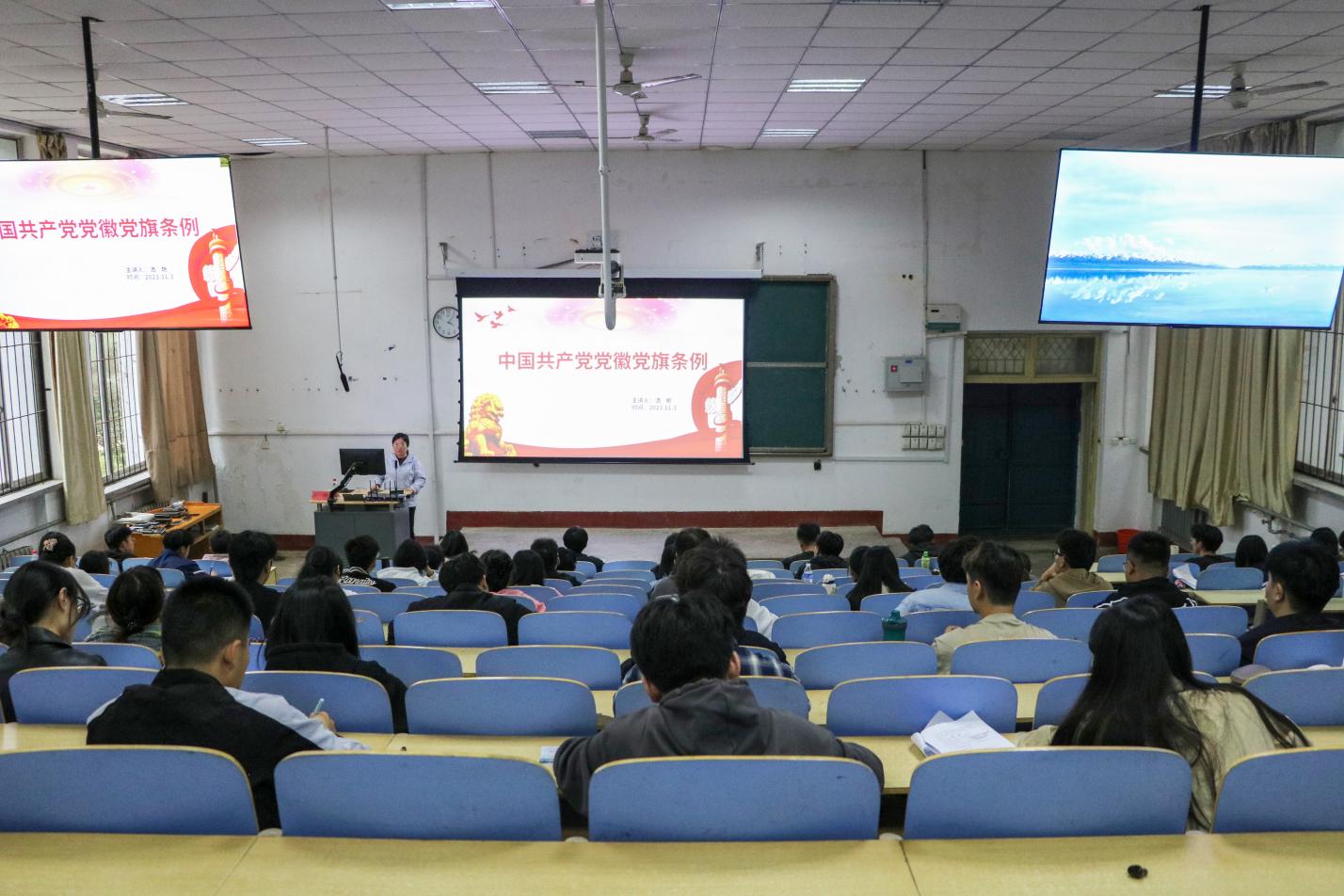 学工办主任、团委书记、第四党支部书记洒艳在1A107为入党积极分子讲授“中国共产党党徽党旗条例”与“开展组织制度学习推进入党积极分子先进思想建设”专题党课。