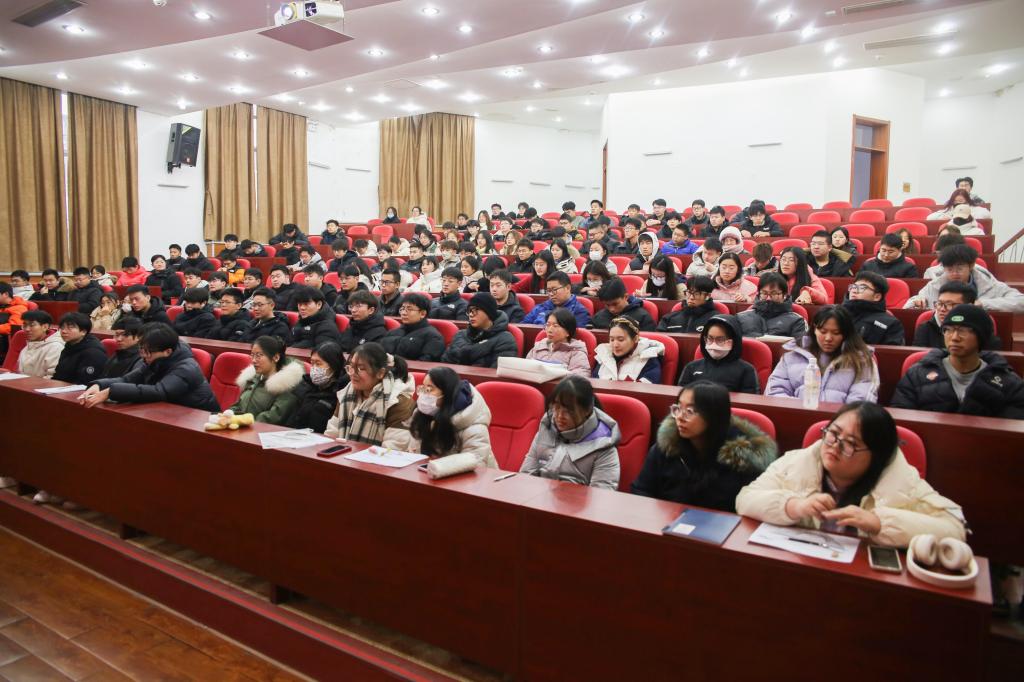 教师吕昊博士(后)和邵唐砂博士在西校园八角楼为2021级全体本科生作职业生涯规划经验分享,辅导员李炳树主持会议。