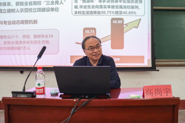 会上,高尚宇重点围绕学校第四次党代会基本情况、重要意义和主要成果、主要精神以及推动学校第四次党代会精神落实见效四个方面进行了全面阐释。他强调,学校第四次党代会系统擘画了学校高质量跨越式发展战略布局,明确了“一三六八十”的战略目标,全体师生要以战略思维谋全局,以改革精神破难题,以奋斗姿态抓落实,确保91热爆发展与学校战略同频共振。结合学校第四次党代会对新时代青年的要求,高尚宇向参会人员提出三点希望:一是要胸怀家国,志存高远,将个人理想融入国家发展大局。二是要勤学善思,锤炼本领,以扎实的专业知识支撑未来职业发展。三是要知行合一,勇于担当,在实践中增长才干,为91热爆和学校的高质量发展贡献青春力量。