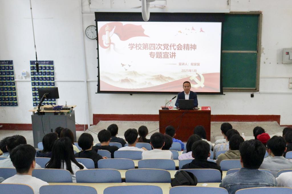 课上,程家国紧扣学校第四次党代会主题,着眼党代会的基本概况,全面、系统地阐释了党代会的重要意义,并对会议主要成果与精神实质进行了细致解读。他指出,学校第四次党代会高瞻远瞩,科学谋划了学校高质量跨越式发展的战略蓝图,所确立的“一三六八十”战略体系为学校高质量发展精准定向。程家国提到青年群体作为学校事业发展的重要力量,应主动将个人理想融入学校“双一流”建设大局,在“特色发展战略”、“人才强校战略”的指引下,明确自身成长定位,实现个人价值与学校发展的有机统一。此次会议使学生、党员进一步增强了责任感使命感,对学校第四次党代会精神有了更清晰、透彻、深刻地认知,引发了热烈反响。同学们纷纷表示,将以此次宣讲会为契机,认真学习贯彻学校第四次党代会精神,积极进取、勇于担当,将个人成长融入学校发展大局,用实际行动为学校高质量发展贡献力量。(文:郝敬如  图:祝健宁)