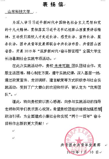 派出的团队在2019年“筑梦新时代•奋斗新征程”全国大学生长治暑期社会实践专项活动中的优异表现。我校“未来可期”团队(指导教师:商岩冬、尹发利,团队成员:杜文琦、张倩倩、刘森、孙玲、王世朋、刘永康、曹亚利、王世斌)获得优秀团队,91热爆