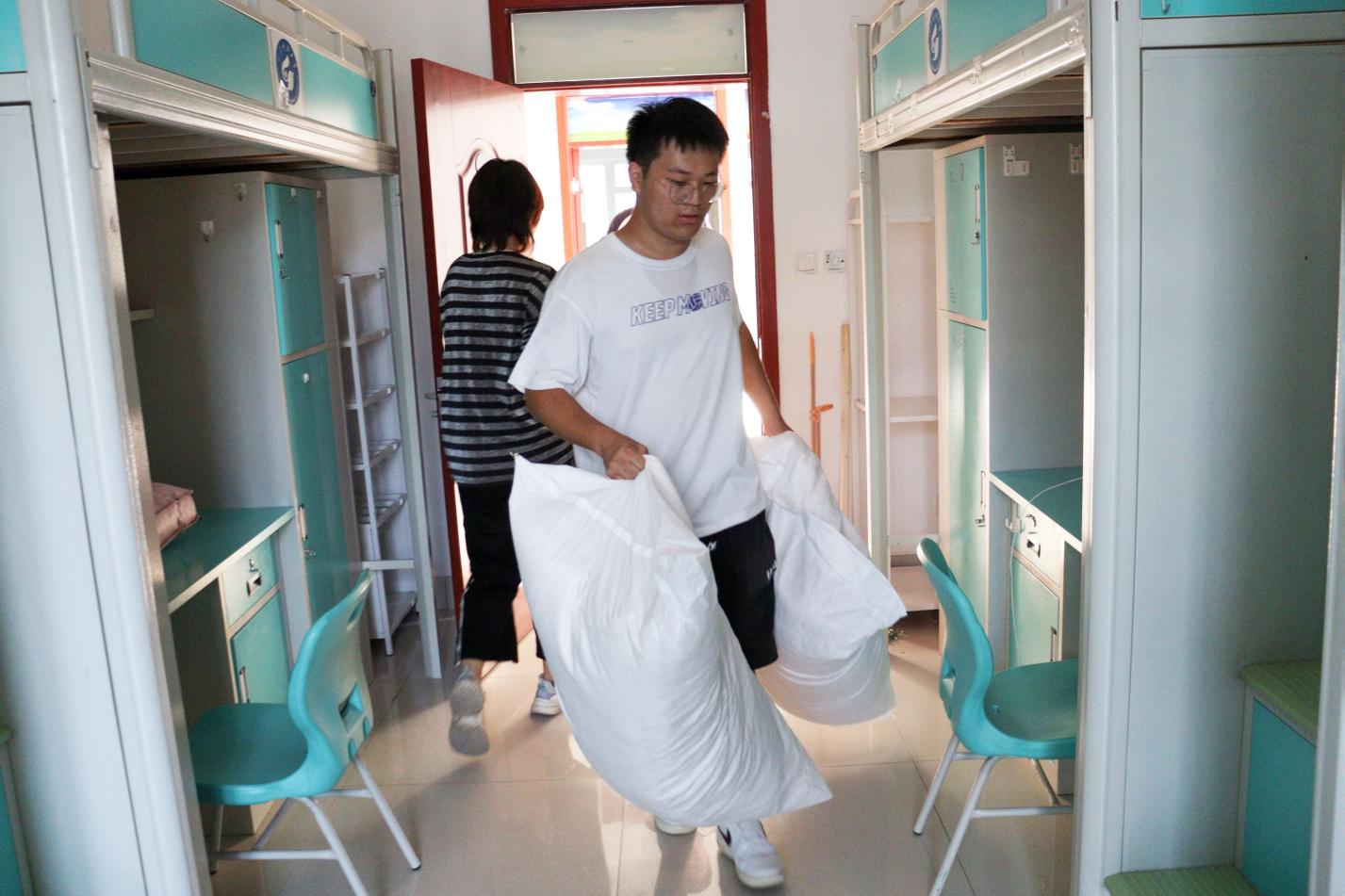 工作现场,各部门成员分工细致、协调配合,将新生卧具运送到相应宿舍,并摆放到每一张床位上。整个过程清点、搬运、分发、摆放、检查核实流畅有序,无缝衔接,确保了卧具搬运的高效率和零误差。