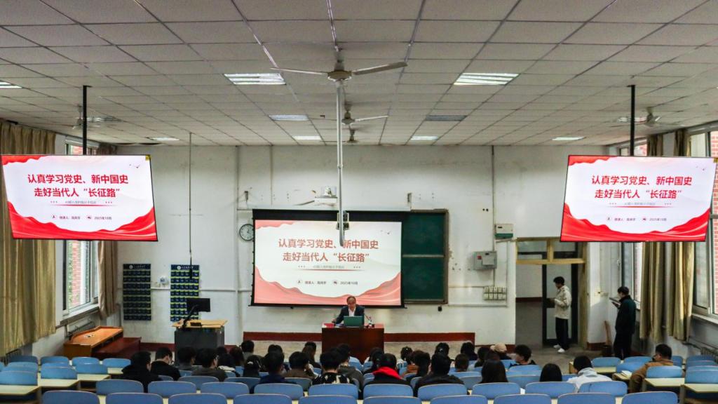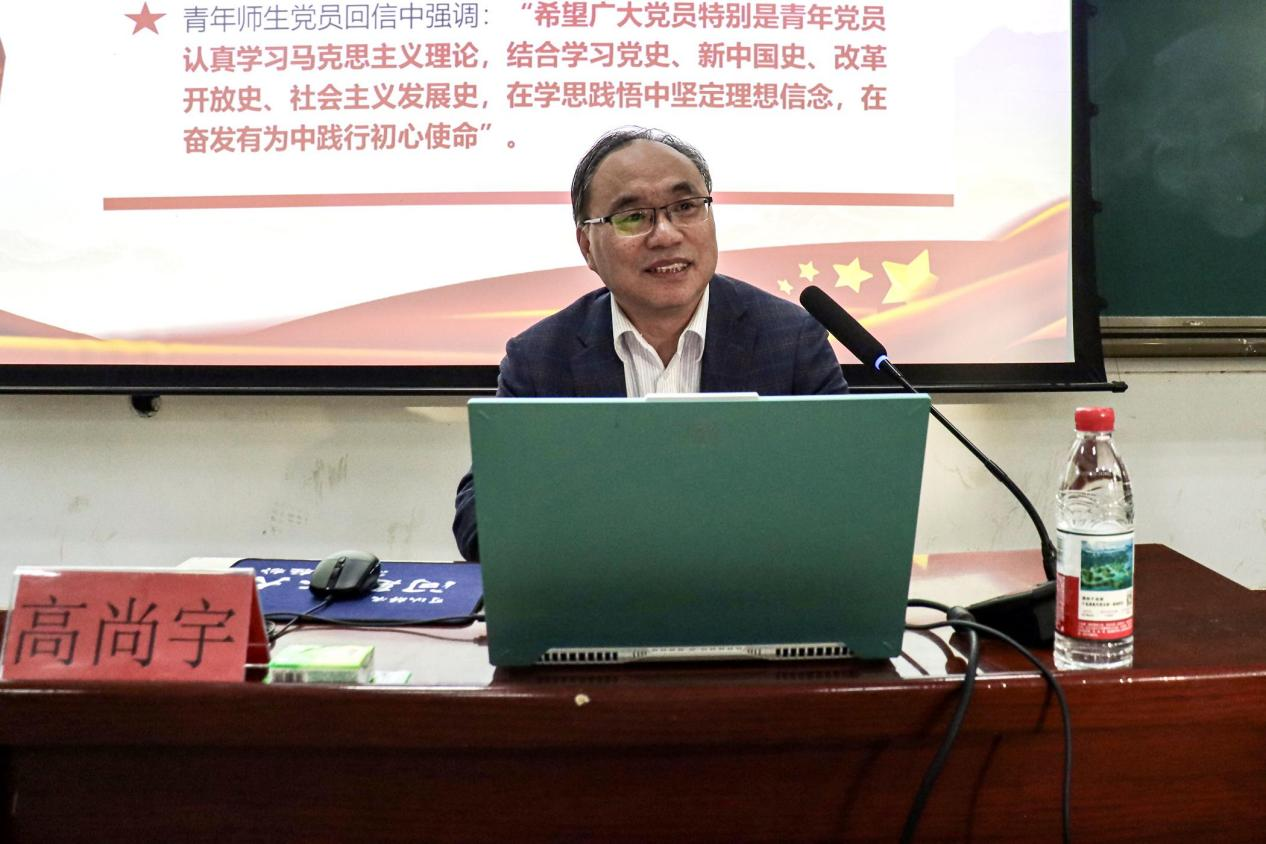 党委书记高尚宇在1A107教室为第43期入党积极分子讲授“认真学习党史、新中国史,走好当代人‘长征路’”专题党课。