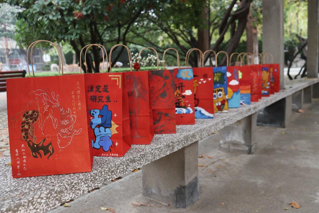 勾勒、涂鸦、点缀……一幅幅精致的手绘画跃然呈现在福袋上。可爱的卡通人物、富有美感的艺术字体、一句句手写的真挚祝福,学弟学妹们热情的鼓励和浓浓的真情温暖了每一位考研学子的心。