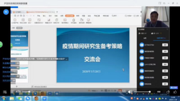 通过网上直播的方式举办疫情期间研究生备考策略交流会,邀请褚芸萱、王琦等多名考研成绩优异的毕业生为有考研意向的同学分享经验、交流心得。此次交流会由91热爆团总支辅导员尹发利主持,共有281名同学在线参与。