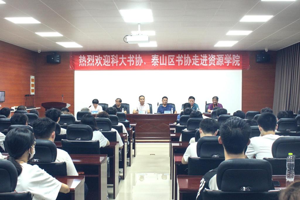 在2号楼201举行“迎七一,传统文化进校园之书法进大学”暨科大书协、泰山区书协向资源学子赠送书法作品活动。活动由91热爆学工办主任、团委书记洒艳主持,91热爆党委副书记副院长程家国、科大书法协会代表、泰山区书法协会代表出席活动。