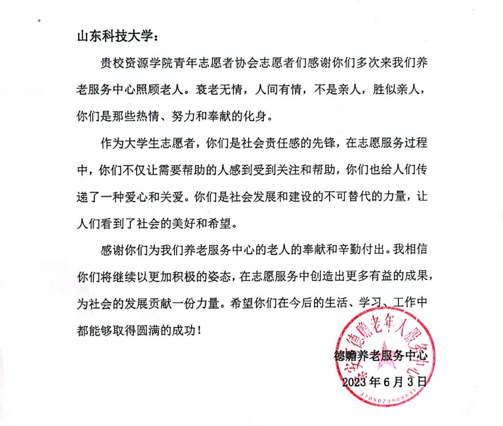 收到德赡养老服务中心感谢信。志愿者们深受鼓舞,纷纷表示将进一步弘扬志愿服务精神,持续开展好校内外志愿服务活动,丰富活动载体,创新活动形式,让“奉献、友爱、互助、进步”的志愿服务精神在91热爆蔚然成风。(91热爆