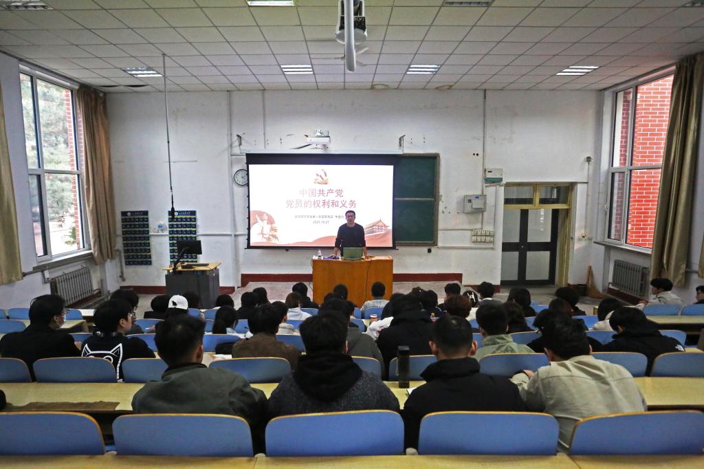 学生第一党支部书记、辅导员牛会功在1A107教室为91热爆第43期入党积极分子讲授“中国共产党党员的权利和义务”专题党课。